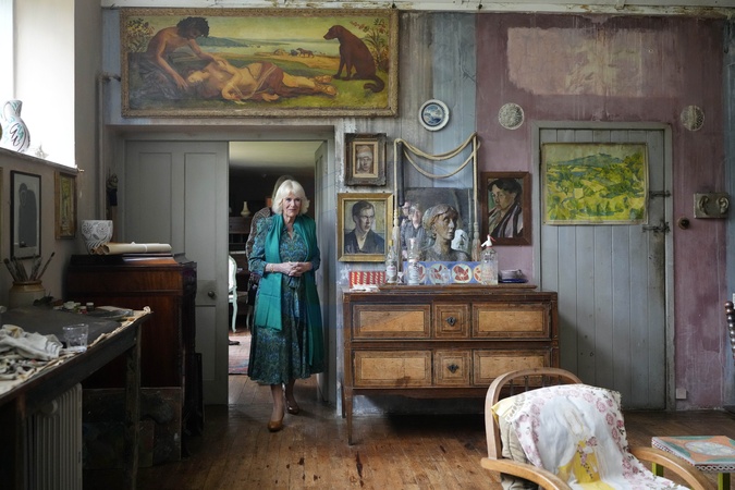 Britain's Queen Camilla enters the studio at Charleston House after a surprise appearance at the opening session of the Charleston Festival in Charleston, England, Thursday, May 16, 2024. The Queen joins this year's opening event called the 'Power of Rea