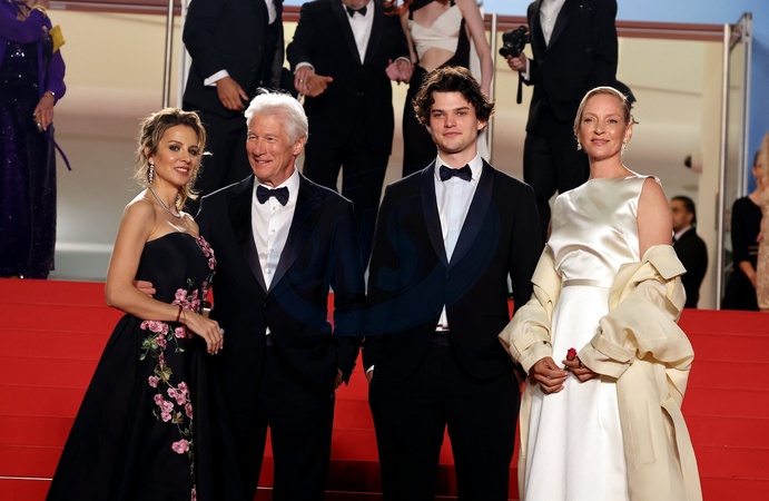 Alejandra Silva et son mari Richard Gere, son fils Homer James Jigme Gere et Uma Thurman - Montée des marches du film « Oh, Canada » lors du 77ème Festival International du Film de Cannes, au Palais des Festivals à Cannes. Le 17 mai 2024 © Jacovides-Moreau / Bestimage Red carpet of the movie « Oh, Canada» during the 77th Cannes International Film Festival at the Palais des Festivals in Cannes, France. On may 17th 2024