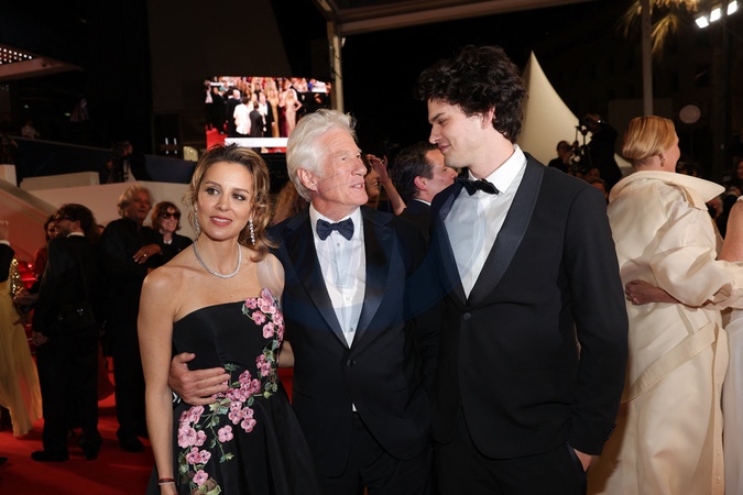 Alejandra Silva, son mari Richard Gere et son fils Homer James Jigme Gere - Descente des marches du film "Oh Canada" lors du 77ème Festival International du Film de Cannes, au Palais des Festivals à Cannes. Le 17 mai 2024 © Jacovides-Moreau / Bestimage People leaving the red carpet of the movie "Oh Canada" during the 77th Cannes International Film Festival at the Palais des Festivals in Cannes, France. On may 17th 2024