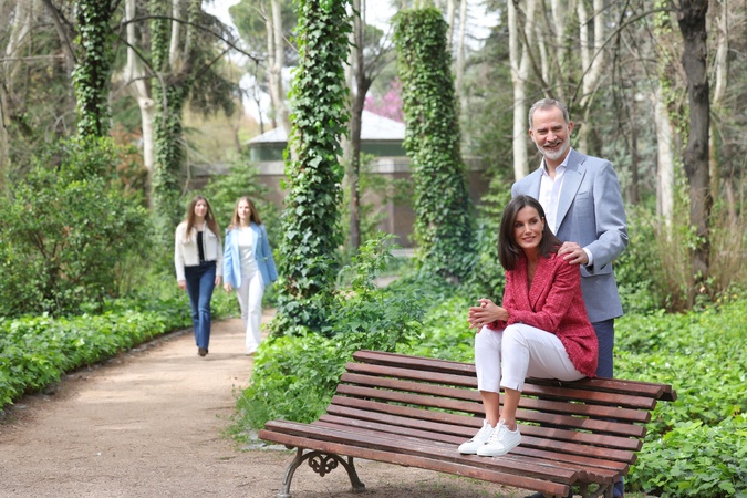 Król Hiszpanii Felipe, królowa Letizia, ich córki, księżniczka Leonor i księżniczka Sofia, pozują z okazji 20. rocznicy ślubu