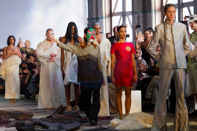 Designer Jackie Wu wearing a mask thanks the audience after the Wackie Ju show during Australian Fashion Week Presented By Pandora 2024 at Carriageworks on May 17, 2024 in Sydney, Australia, Credit:IOIO IMAGES / Avalon