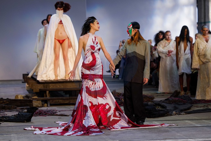 Designer Jackie Wu (R) thanks the audience after the Wackie Ju show during Australian Fashion Week Presented By Pandora 2024 at Carriageworks on May 17, 2024 in Sydney, Australia, Credit:IOIO IMAGES / Avalon
