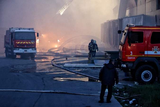 ODESA, UKRAINE - MAY 17, 2024 - Rescuers work at a civil enterprise damaged by a Russian missile attack, Odesa, southern Ukraine. firefighter, fire engine, Credit:Nina Liashonok / Avalon