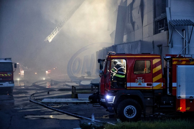 ODESA, UKRAINE - MAY 17, 2024 - Rescuers work at a civil enterprise damaged by a Russian missile attack, Odesa, southern Ukraine. firefighter, fire engine, Credit:Nina Liashonok / Avalon