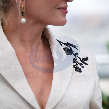 Uma Thurman poses at the Photocall for Oh Canada during the 77th Festival de Cannes on Saturday 18 May 2024 at Le Palais des festivals, Cannes. Fashion Detail - Embroidery., Credit:Julie Edwards / Avalon