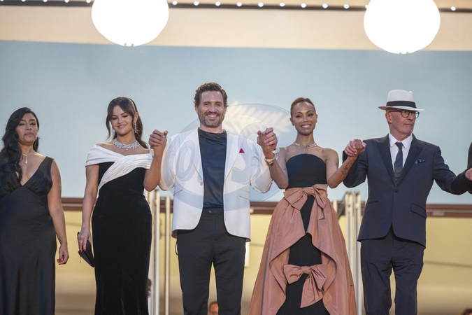 Selena Gomez, Edgar Ramirez, Zoe Saldana, Jacques Audiard, Karla Sofia Gascon - Descente des marches du film « Emilia Perez » lors du 77ème Festival International du Film de Cannes, au Palais des Festivals à Cannes. Le 18 mai 2024 © Olivier Borde / Bestimage People leaving the red carpet of the movie « Emilia Perez » during the 77th Cannes International Film Festival at the Palais des Festivals in Cannes, France. On may 18th 2024