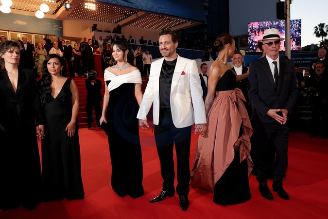 Adriana Paz, Selena Gomez, Edgar Ramirez, Zoe Saldana, Jacques Audiard, Damien Jalet - Descente des marches du film « Emilia Perez » lors du 77ème Festival International du Film de Cannes, au Palais des Festivals à Cannes. Le 18 mai 2024 © Jacovides-Moreau / Bestimage People leaving the red carpet of the movie « Emilia Perez » during the 77th Cannes International Film Festival at the Palais des Festivals in Cannes, France. On may 18th 2024