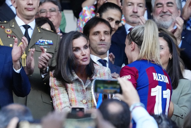 La reine Letizia d'Espagne assiste à la Coupe de la Reine 2024 (football féminin) entre le FC Barcelone et la Real Sociedad à Saragosse