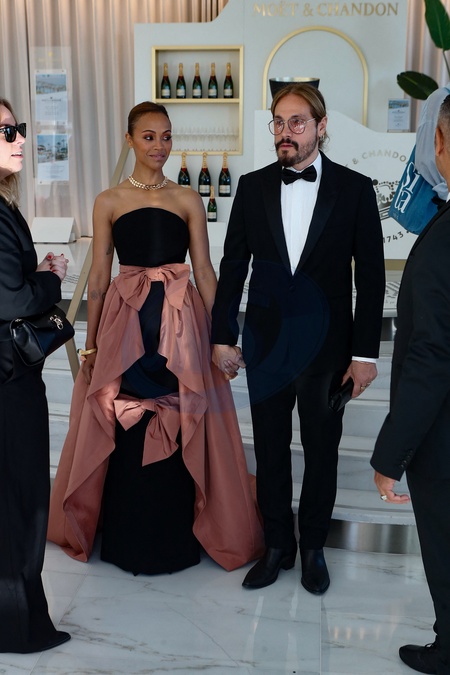 Zoe Saldana et son mari Marco Perego - Sorties de l'hôtel JW Marriott à Cannes, France, le 18 mai 2024. © Christophe Clovis / Bestimage Celebrities leaving hotel JW Marriott suring the 77th Cannes International Film Festival on May 18, 2024
