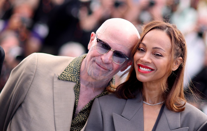 Jacques Audiard et Zoe Saldana - Photocall du film "Emilia Perez" lors du 77ème Festival International du Film de Cannes le 19 mai 2024. © Jacovides / Moreau / Bestimage Photocall for the film "Emilia Perez" at the 77th Cannes International Film Festival on 19 May 2024