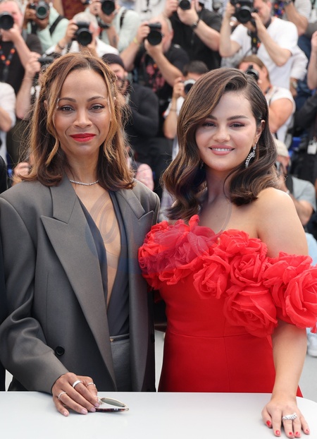 Zoe Saldana et Selena Gomez - Photocall du film "Emilia Perez" lors du 77ème Festival International du Film de Cannes le 19 mai 2024. © Jacovides / Moreau / Bestimage Photocall for the film "Emilia Perez" at the 77th Cannes International Film Festival on 19 May 2024