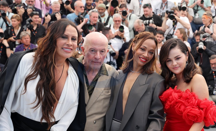 Karla Sofía Gascón, Jacques Audiard, Zoe Saldana et Selena Gomez - Photocall du film "Emilia Perez" lors du 77ème Festival International du Film de Cannes le 19 mai 2024. © Jacovides / Moreau / Bestimage Photocall for the film "Emilia Perez" at the 77th Cannes International Film Festival on 19 May 2024