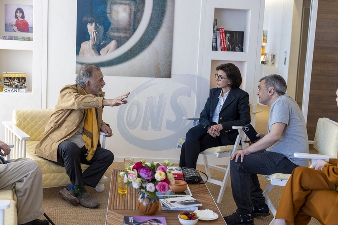 Exclusif - No Tabloids - No Web - Entretien de Rachida Dati (ministre de culture) avec le réalisateur americain Francis Ford Coppola en présence deThomas Langmann (producteur associé du film) dans une suite de l'hôtel Majectic à Cannes lors du 77ème Festival International du Film de Cannes le 18 mai 2024. La ministre de la Culture a été très fière de rencontrer l'îcone du cinéma americain. © Olivier Borde/Bestimage Exclusive - No Tabloids - No Web - For Germany call for price - Interview by Rachida Dati (minister of culture) with American director Francis Ford Coppola in the presence o Thomas Langmann (associate producer of the film) during the 77th Cannes International Film Festival on May 18, 2024.