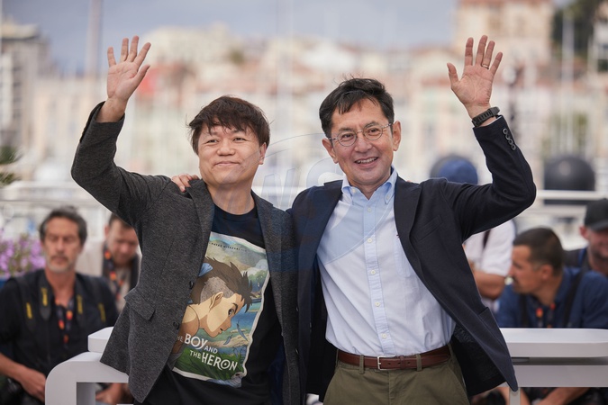 Kenichi Yoda, Gorō Miyazak - Photocall de la remise de la Palme d'Or d'Honneur au studio GHILBI lors du 77ème Festival International du Film de Cannes le 20 mai 2024. © Jacovides-Moreau/Bestimage Photocall for the Palme D'Or Winner Studio Ghibli at the 77th annual Cannes Film Festival at Palais des Festivals on May 20, 2024 in Cannes, France.