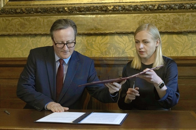 Britain's Foreign Secretary David Cameron and Finland's Foreign Minister Elina Valtonen sign a strategic partnership in London, Monday, May 20, 2024., Credit:Alastair Grant / Avalon