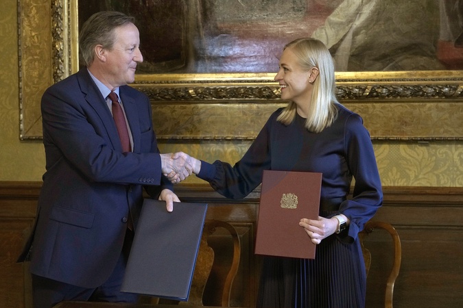 Britain's Foreign Secretary David Cameron and Finland's Foreign Minister Elina Valtonen shake hands after signing a strategic partnership in London, Monday, May 20, 2024., Credit:Alastair Grant / Avalon