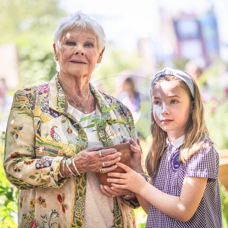 London, UK, 20th May 2024. Dame Judi Dench attends the Octavia Hill Garden by Blue Diamond with the National Trust. She is joined by Charlotte, a student at a Northumbrian School to place a seedling from the Sycamore Gap Tree RHS Chelsea Flower Show 2024 opens with its press day, revealing new garden designs, floral displays and horticultural products from 21-25th May., Credit:Imageplotter / Avalon