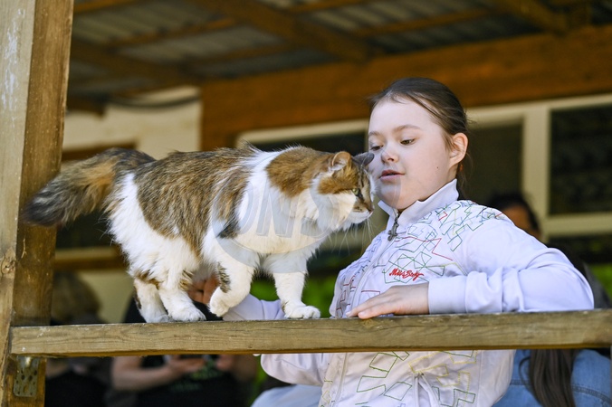 ZAPORIZHZHIA, UKRAINE - MAY 18, 2024 - A student of the Zaporizhzhia Special Boarding School "Dzherelo" looks at a cat on the premises of the Patriot Zaporizhzhia Equestrian Club within the framework of the project "United by Zaporizhzhia: Inspiration Expedition" on Khortytsia Island, Zaporizhzhia, southeastern Ukraine., Credit:Dmytro Smolienko / Avalon