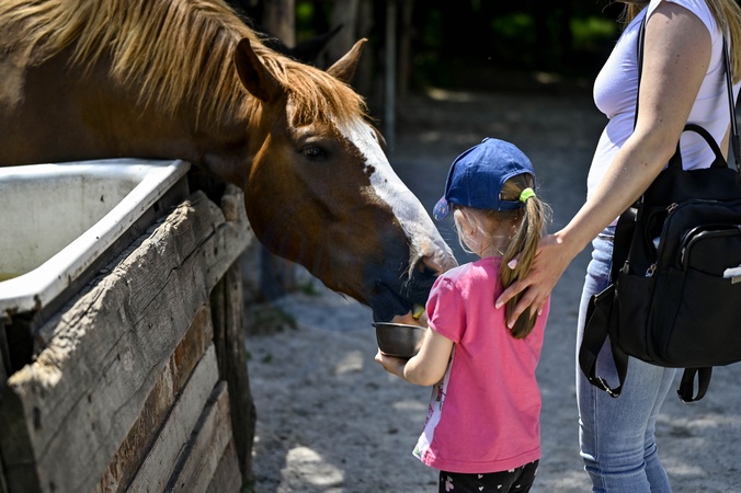 ZAPORIZHZHIA, UKRAINE - MAY 18, 2024 - A student of the Zaporizhzhia Special Boarding School "Dzherelo" feeds a horse on the premises of the Patriot Zaporizhzhia Equestrian Club within the framework of the project "United by Zaporizhzhia: Inspiration Expedition" on Khortytsia Island, Zaporizhzhia, southeastern Ukraine., Credit:Dmytro Smolienko / Avalon