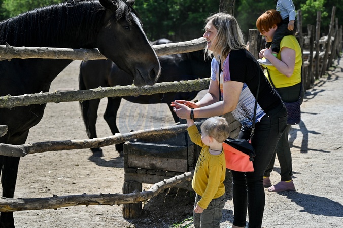 ZAPORIZHZHIA, UKRAINE - MAY 18, 2024 - A student of the Zaporizhzhia Special Boarding School "Dzherelo" feeds a horse on the premises of the Patriot Zaporizhzhia Equestrian Club within the framework of the project "United by Zaporizhzhia: Inspiration Expedition" on Khortytsia Island, Zaporizhzhia, southeastern Ukraine., Credit:Dmytro Smolienko / Avalon