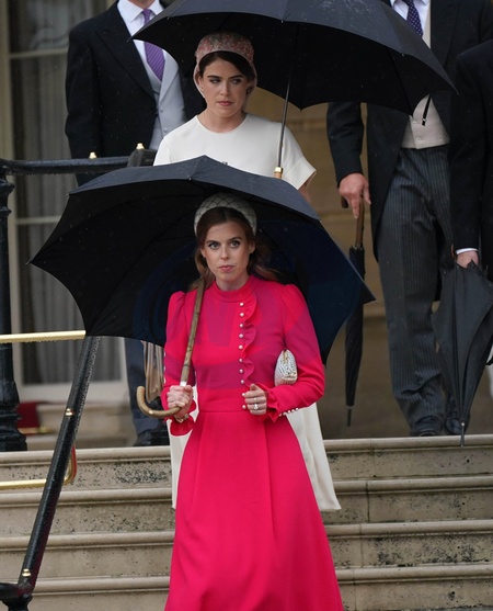 London, UK, 21 May 2024: Princess Eugenie (in red) and Princess Beatrice (in white) arrive for the Royal Garden Party organised by King Charles III at Buckingham Palace in London., Credit:Yui Mok / Avalon