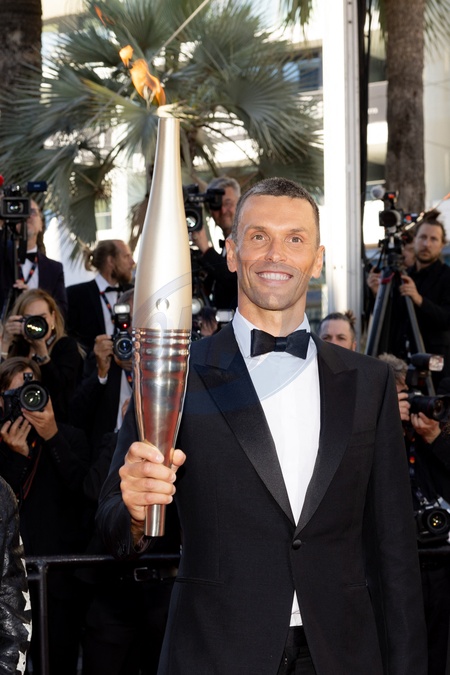 Alexis Hanquinquant et la flamme Olympique - Montée des marches du film « Marcello Mio » lors du 77ème Festival International du Film de Cannes, au Palais des Festivals à Cannes. Le 21 mai 2024 © Jacovides-Moreau / Bestimage Red carpet of the movie « Marcello Mio » during the 77th Cannes International Film Festival at the Palais des Festivals in Cannes, France. On may 21th 2024
