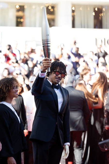 Nélia Barbosa, Arnaud Assoumani et la flamme olympique - Montée des marches du film « Marcello Mio » lors du 77ème Festival International du Film de Cannes, au Palais des Festivals à Cannes. Le 21 mai 2024 © Jacovides-Moreau / Bestimage Red carpet of the movie « Marcello Mio » during the 77th Cannes International Film Festival at the Palais des Festivals in Cannes, France. On may 21th 2024