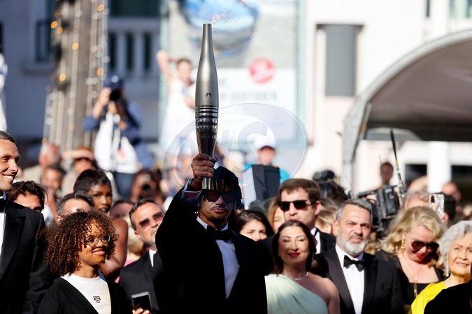 Nélia Barbosa, Arnaud Assoumani et la flamme olympique - Montée des marches du film « Marcello Mio » lors du 77ème Festival International du Film de Cannes, au Palais des Festivals à Cannes. Le 21 mai 2024 © Jacovides-Moreau / Bestimage Red carpet of the movie « Marcello Mio » during the 77th Cannes International Film Festival at the Palais des Festivals in Cannes, France. On may 21th 2024