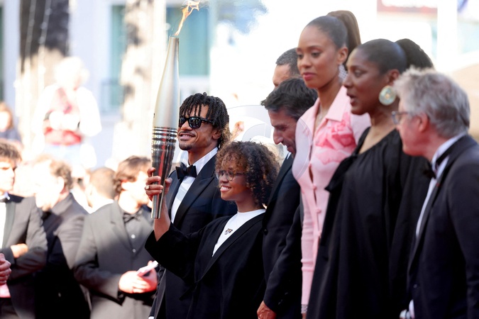 Arnaud Assoumani, Nélia Barbosa et la flamme olympique - Montée des marches du film « Marcello Mio » lors du 77ème Festival International du Film de Cannes, au Palais des Festivals à Cannes. Le 21 mai 2024 © Jacovides-Moreau / Bestimage Red carpet of the movie « Marcello Mio » during the 77th Cannes International Film Festival at the Palais des Festivals in Cannes, France. On may 21th 2024