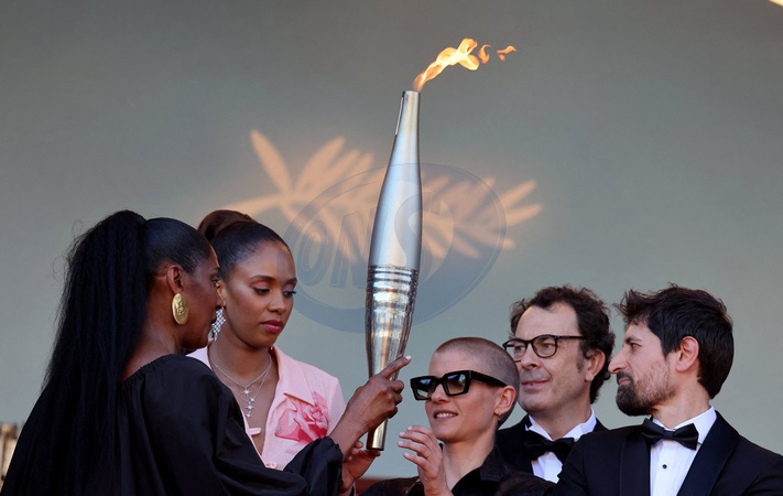 Marie-Josée Perec et la flamme Olympique, Iliana Rupert, Marie Patouillet, guest - Montée des marches du film « Marcello Mio » lors du 77ème Festival International du Film de Cannes, au Palais des Festivals à Cannes. Le 21 mai 2024 © Jacovides-Moreau / Bestimage Red carpet of the movie « Marcello Mio » during the 77th Cannes International Film Festival at the Palais des Festivals in Cannes, France. On may 21th 2024