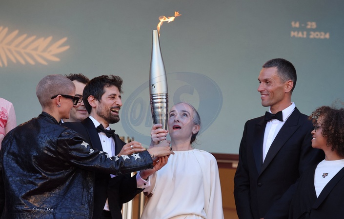 Marie Patouillet, guest, Delphine Ernotte et la flamme olympique, Alexis Hanquinquant, Nélia Barbosa - Montée des marches du film « Marcello Mio » lors du 77ème Festival International du Film de Cannes, au Palais des Festivals à Cannes. Le 21 mai 2024 © Jacovides-Moreau / Bestimage Red carpet of the movie « Marcello Mio » during the 77th Cannes International Film Festival at the Palais des Festivals in Cannes, France. On may 21th 2024