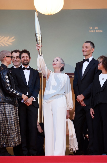 Marie Patouillet, guest, Delphine Ernotte et la flamme olympique, Alexis Hanquinquant, Nélia Barbosa - Montée des marches du film « Marcello Mio » lors du 77ème Festival International du Film de Cannes, au Palais des Festivals à Cannes. Le 21 mai 2024 © Jacovides-Moreau / Bestimage Red carpet of the movie « Marcello Mio » during the 77th Cannes International Film Festival at the Palais des Festivals in Cannes, France. On may 21th 2024