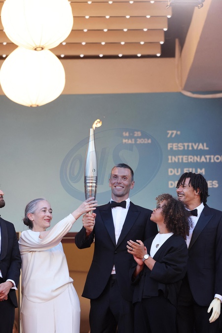 Delphine Ernotte et la flamme olympique, Alexis Hanquinquant, Nélia Barbosa, Arnaud Assoumani - Montée des marches du film « Marcello Mio » lors du 77ème Festival International du Film de Cannes, au Palais des Festivals à Cannes. Le 21 mai 2024 © Jacovides-Moreau / Bestimage Red carpet of the movie « Marcello Mio » during the 77th Cannes International Film Festival at the Palais des Festivals in Cannes, France. On may 21th 2024