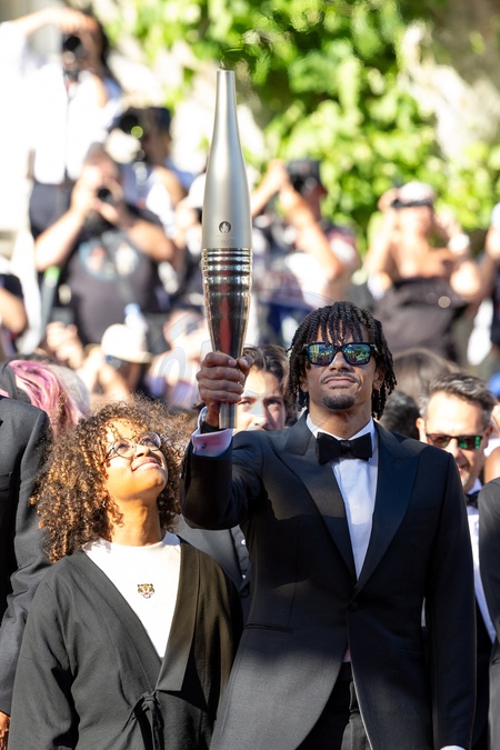 Nélia Barbosa, Arnaud Assoumani et la flamme olympique - Montée des marches du film « Marcello Mio » lors du 77ème Festival International du Film de Cannes, au Palais des Festivals à Cannes. Le 21 mai 2024 © Jacovides-Moreau / Bestimage Red carpet of the movie « Marcello Mio » during the 77th Cannes International Film Festival at the Palais des Festivals in Cannes, France. On may 21th 2024
