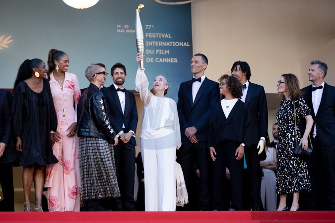 Marie-Josée Perec, Iliana Rupert, Marie Patouillet, guest, Delphine Ernotte et la flamme olympique, Alexis Hanquinquant, Nélia Barbosa, Arnaud Assoumani, guest - Montée des marches du film « Marcello Mio » lors du 77ème Festival International du Film de Cannes, au Palais des Festivals à Cannes. Le 21 mai 2024 © Jacovides-Moreau / Bestimage Red carpet of the movie « Marcello Mio » during the 77th Cannes International Film Festival at the Palais des Festivals in Cannes, France. On may 21th 2024