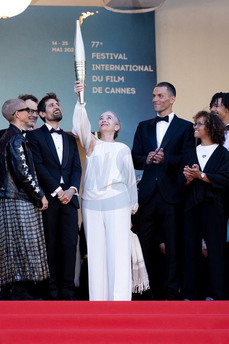 Marie Patouillet, guest, Delphine Ernotte et la flamme olympique, Alexis Hanquinquant, Nélia Barbosa, Arnaud Assoumani - Montée des marches du film « Marcello Mio » lors du 77ème Festival International du Film de Cannes, au Palais des Festivals à Cannes. Le 21 mai 2024 © Jacovides-Moreau / Bestimage Red carpet of the movie « Marcello Mio » during the 77th Cannes International Film Festival at the Palais des Festivals in Cannes, France. On may 21th 2024