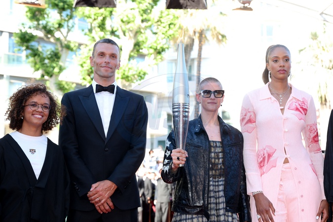 Nélia Barbosa, Alexis Hanquinquant, Marie Patouillet et la flamme Olympique, Iliana Rupert - Montée des marches du film « Marcello Mio » lors du 77ème Festival International du Film de Cannes, au Palais des Festivals à Cannes. Le 21 mai 2024 © Jacovides-Moreau / Bestimage Red carpet of the movie « Marcello Mio » during the 77th Cannes International Film Festival at the Palais des Festivals in Cannes, France. On may 21th 2024
