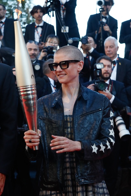 Marie Patouillet et la flamme Olympique - Montée des marches du film « Marcello Mio » lors du 77ème Festival International du Film de Cannes, au Palais des Festivals à Cannes. Le 21 mai 2024 © Christophe Clovis / Bestimage Red carpet of the movie « Marcello Mio » during the 77th Cannes International Film Festival at the Palais des Festivals in Cannes, France. On may 21th 2024