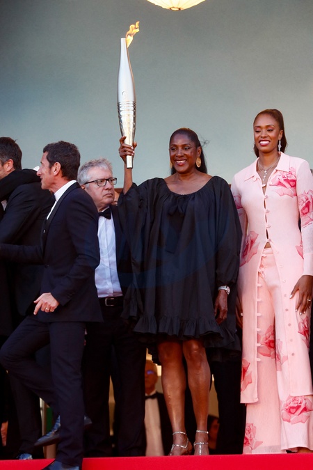 Marie-José Pérec et la flamme Olympique - Montée des marches du film « Marcello Mio » lors du 77ème Festival International du Film de Cannes, au Palais des Festivals à Cannes. Le 21 mai 2024 © Christophe Clovis / Bestimage Red carpet of the movie « Marcello Mio » during the 77th Cannes International Film Festival at the Palais des Festivals in Cannes, France. On may 21th 2024