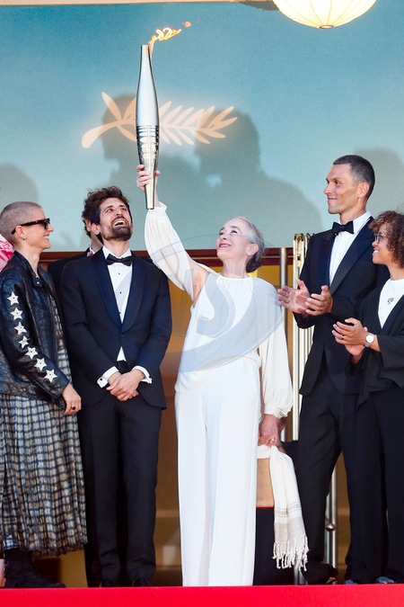 Delphine Ernotte et la flamme Olympique - Montée des marches du film « Marcello Mio » lors du 77ème Festival International du Film de Cannes, au Palais des Festivals à Cannes. Le 21 mai 2024 © Christophe Clovis / Bestimage Red carpet of the movie « Marcello Mio » during the 77th Cannes International Film Festival at the Palais des Festivals in Cannes, France. On may 21th 2024
