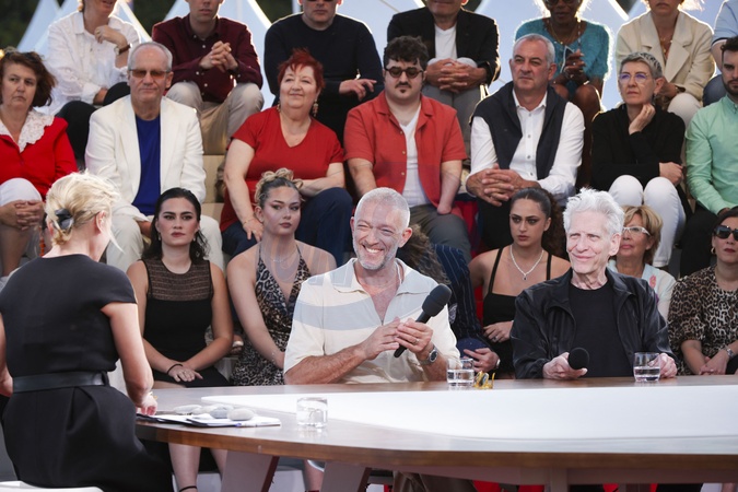 Exclusif - Anne-Elisabeth Lemoine, Vincent Cassel, David Cronenberg - Plateau de l'émission "C à vous" lors du 77ème Festival International du Film de Cannes le 21 mai 2024. © Jack Tribeca/Bestimage No Web - Belgique et Suisse Set of the show "C à vous” during the 77th Cannes International Film Festival on May 21, 2024.