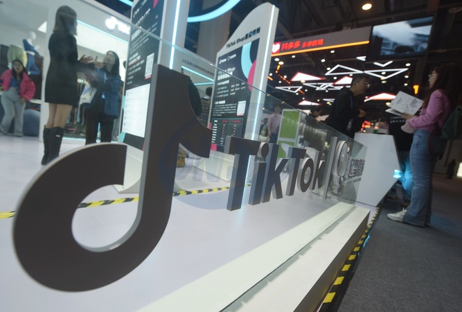 People stop by the booth of TikTok during a trade show for tech companies in Hangzhou in east China's Zhejiang province Thursday, Nov. 23, 2023., Credit:LONG WEI / Avalon