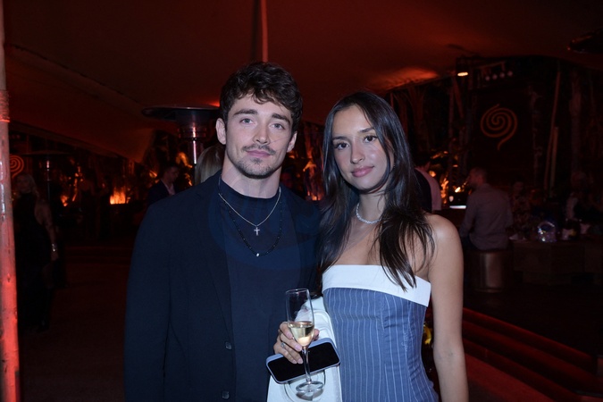Semi-exclusif - Charles Leclerc et sa compagne Alexandra Saint-Mleux - Soirée APM Monaco au restaurant "le Baoli " pour le lancement de la nouvelle collection été APM Monaco lors du 77ème Festival International du Film de Cannes le 22 mai 2024. K. Prette, directrice artistique lance une collection 100% Gold pour cet été avec comme nouvelle égérie de la maison, C. Delevigne. © Rachid Bellak/Bestimage Semi-exclusive - APM Monaco evening at the "le Baoli" restaurant for the launch of the new APM Monaco summer collection during the 77th Cannes International Film Festival on May 22, 2024. K. Prette, artistic director is launching a 100% Gold collection for this summer with as new muse of the house, C. Delevigne.