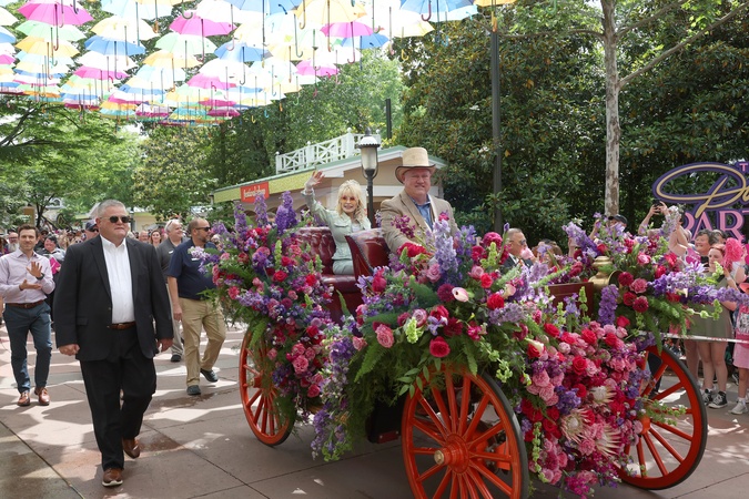 Dolly Parton riding in the Dewitt in the Dollywood Parade celebrating the opening of the Dolly Parton Experience at Dollywood on May 25, 2024, in Pigeon Forge, TN. © Curtis Hilbun/AFF-USA.COM** NO US TABLOIDS**