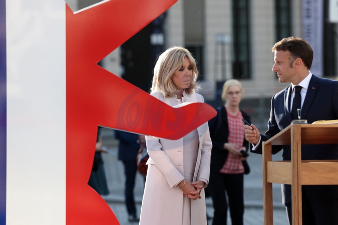 Emmanuel Macron i Brigitte Macron powitani przez burmistrza i gubernatora Berlina przy Bramie Brandenburskiej podczas trzydniowej wizyty państwowej w Niemczech