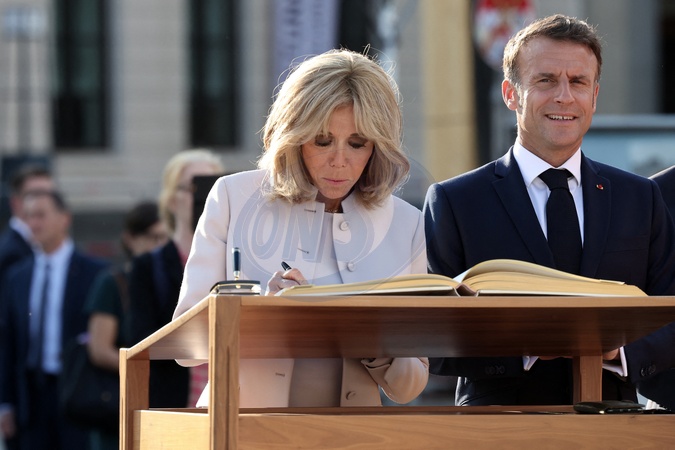 Emmanuel Macron i Brigitte Macron powitani przez burmistrza i gubernatora Berlina przy Bramie Brandenburskiej podczas trzydniowej wizyty państwowej w Niemczech