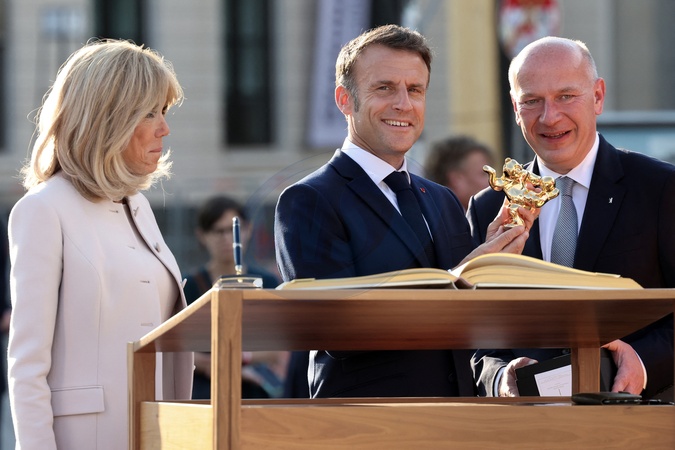 Le président français, Emmanuel Macron et la première dame, Brigitte Macron accueilis par le Bourgmestre gouverneur de Berlin à la Porte de Brandebourg, lors une visite d'Etat de trois jours en Allemagne, le 26 mai 2024. © Stéphane Lemouton / Bestimage French President Emmanuel Macron and First Lady Brigitte Macron welcomed by the Mayor and Governor of Berlin at the Brandenburg Gate during a three-day state visit to Germany on May 26, 2024.