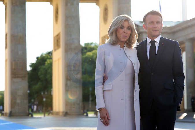 Le président français, Emmanuel Macron et la première dame, Brigitte Macron accueilis par le Bourgmestre gouverneur de Berlin à la Porte de Brandebourg, lors une visite d'Etat de trois jours en Allemagne, le 26 mai 2024. © Stéphane Lemouton / Bestimage French President Emmanuel Macron and First Lady Brigitte Macron welcomed by the Mayor and Governor of Berlin at the Brandenburg Gate during a three-day state visit to Germany on May 26, 2024.