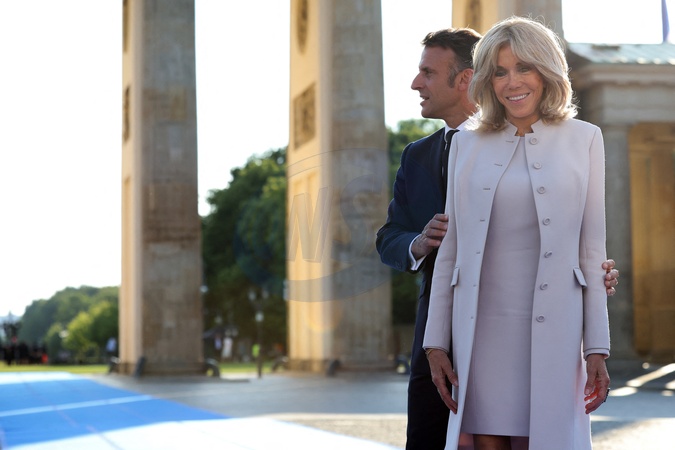 Le président français, Emmanuel Macron et la première dame, Brigitte Macron accueilis par le Bourgmestre gouverneur de Berlin à la Porte de Brandebourg, lors une visite d'Etat de trois jours en Allemagne, le 26 mai 2024. © Stéphane Lemouton / Bestimage French President Emmanuel Macron and First Lady Brigitte Macron welcomed by the Mayor and Governor of Berlin at the Brandenburg Gate during a three-day state visit to Germany on May 26, 2024.
