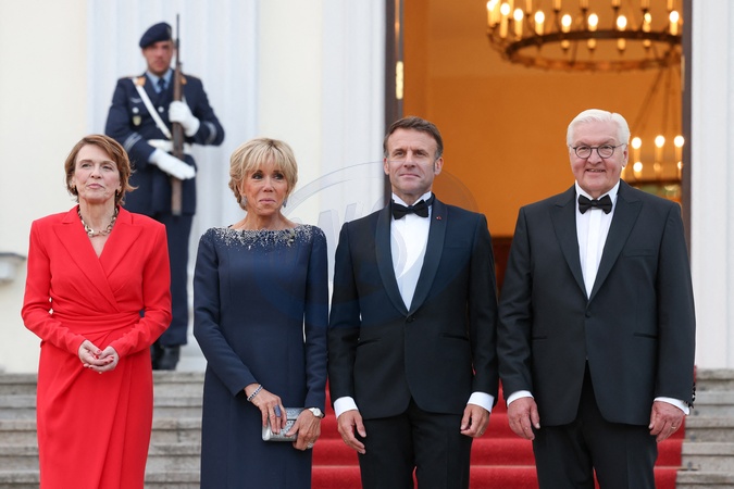 Le président français, Emmanuel Macron et la première dame, Brigitte Macron accueilis par Franck-Walter Steinmeier, président de la république fédérale d'Allemagne et madame Elke Budenbender pour un diner d'état, au château de Bellevue, lors une visite d'Etat de trois jours en Allemagne, le 26 mai 2024. © Stéphane Lemouton / Bestimage The French President, Emmanuel Macron and the First Lady, Brigitte Macron welcomed by Franck-Walter Steinmeier, President of the Federal Republic of Germany and Mrs. Elke Budenbender for a state dinner, at Bellevue Castle, during a state visit three days in Germany